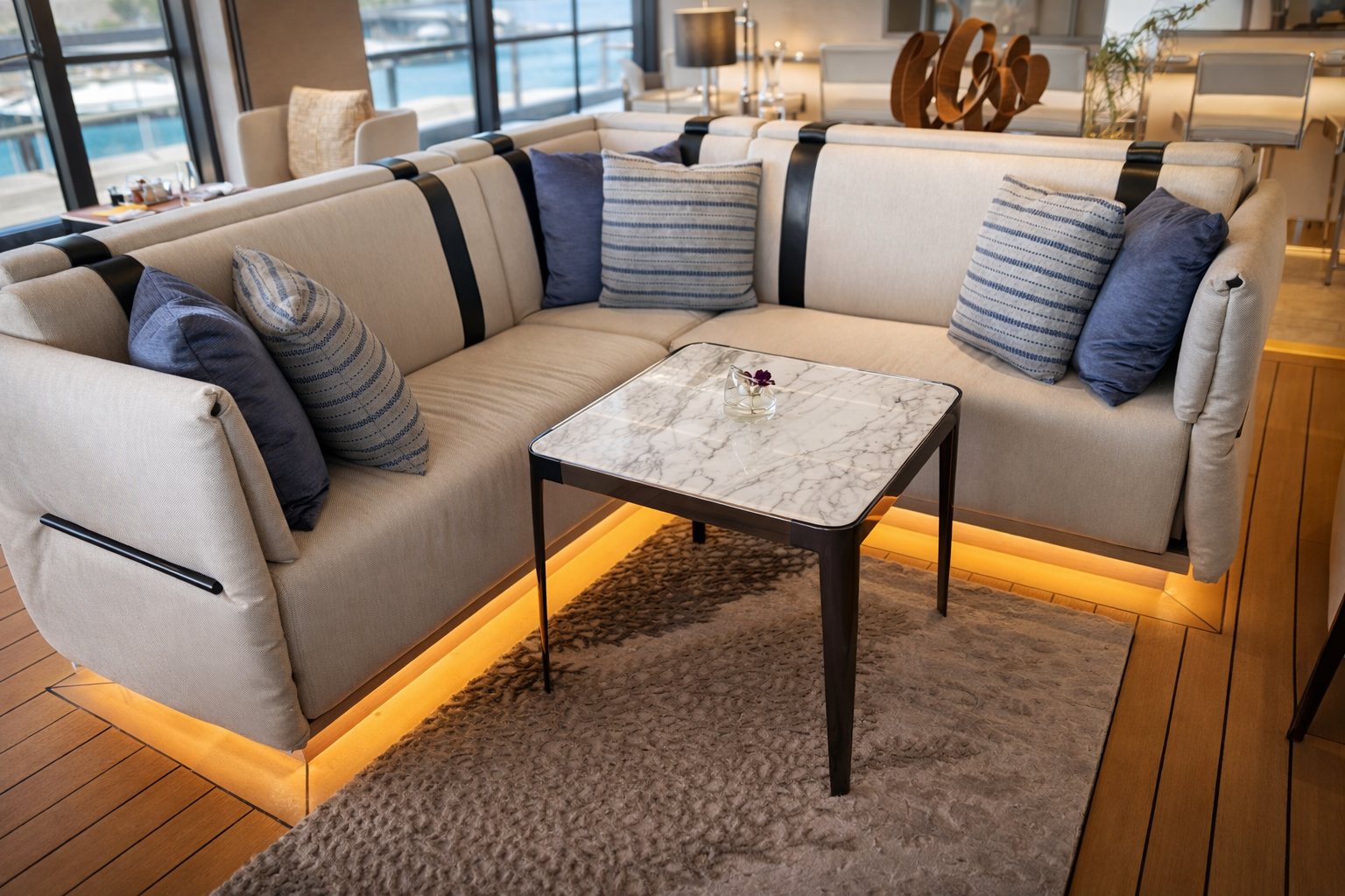 Sleek Table created through a complex finish of polished stainless steel and black mirror with marble stone top and tapered legs.
