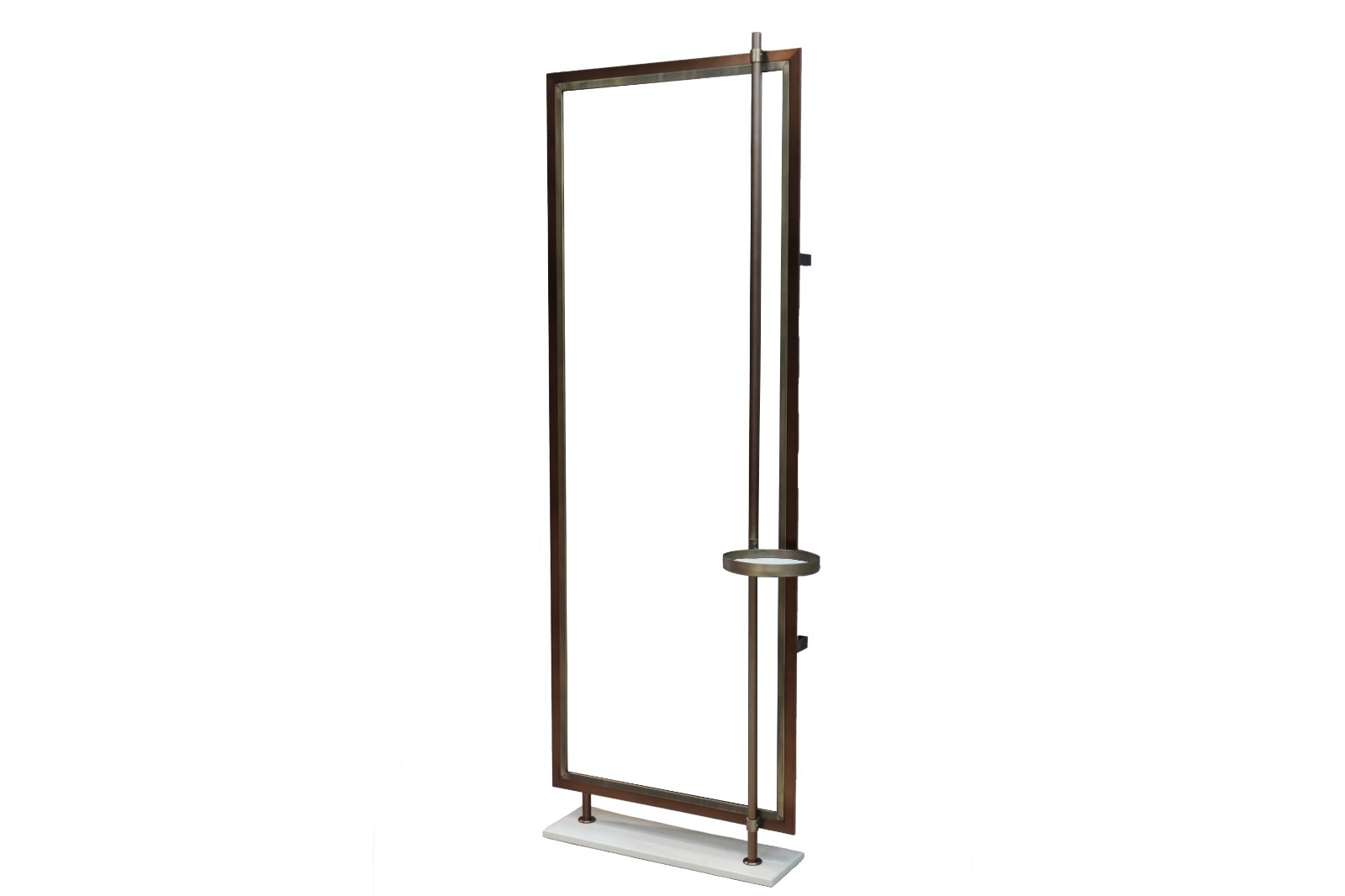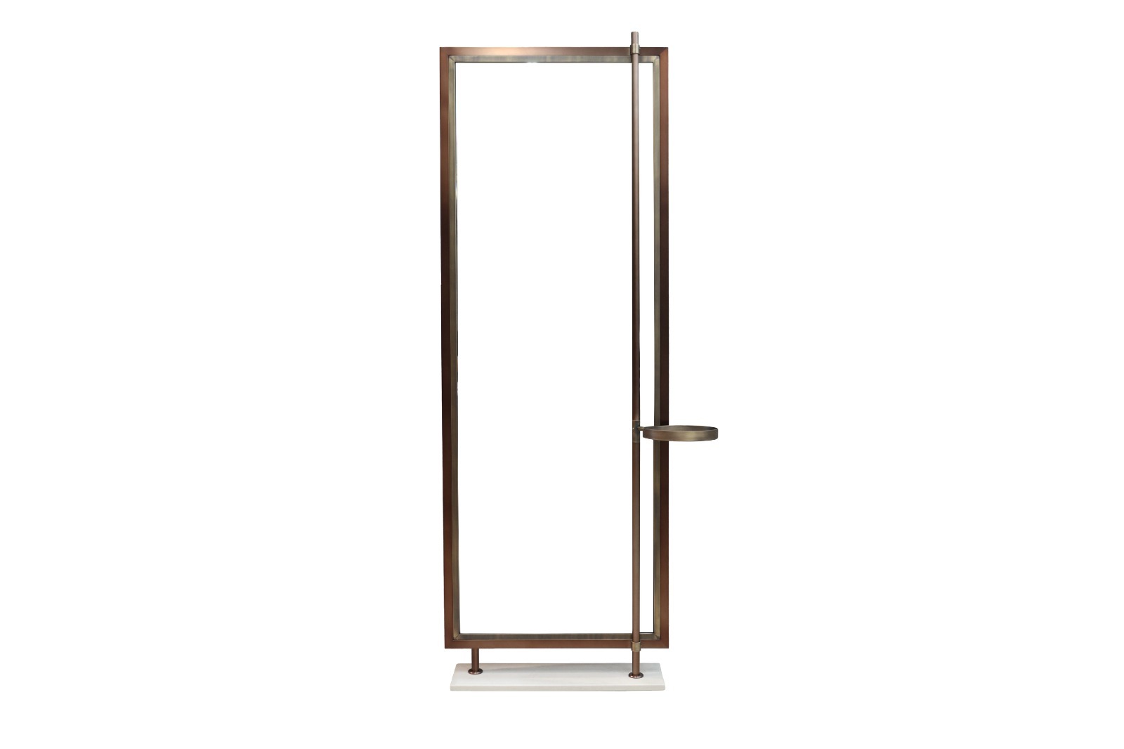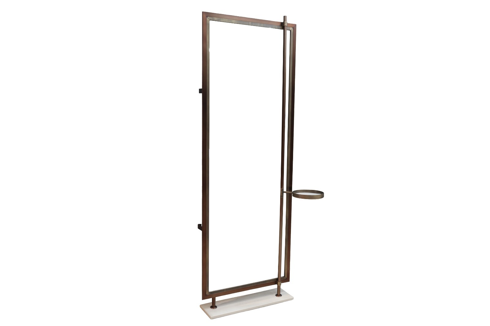 A modern composition of lines and voids, this mirror blends geometric clarity with refined materials. The vertical structure features a cantilevered tray, echoing balance and proportion in an artful, gallery-like form.