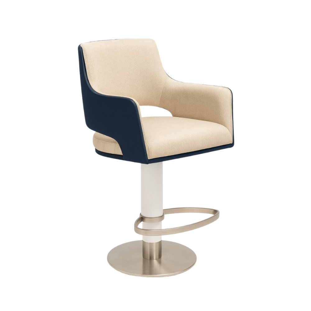 The Eva Barstool is a modern interpretation of comfort and elegance, designed to elevate any contemporary dining or bar setting. Its sleek silhouette features a gently curved backrest and integrated armrests for ergonomic support. Upholstered in a soft beige fabric, the seat contrasts beautifully with the deep navy exterior shell, creating a sophisticated two-tone effect. The stool rests on a polished stainless-steel pedestal base with a circular footrest for added stability and comfort, making it both stylish and functional.