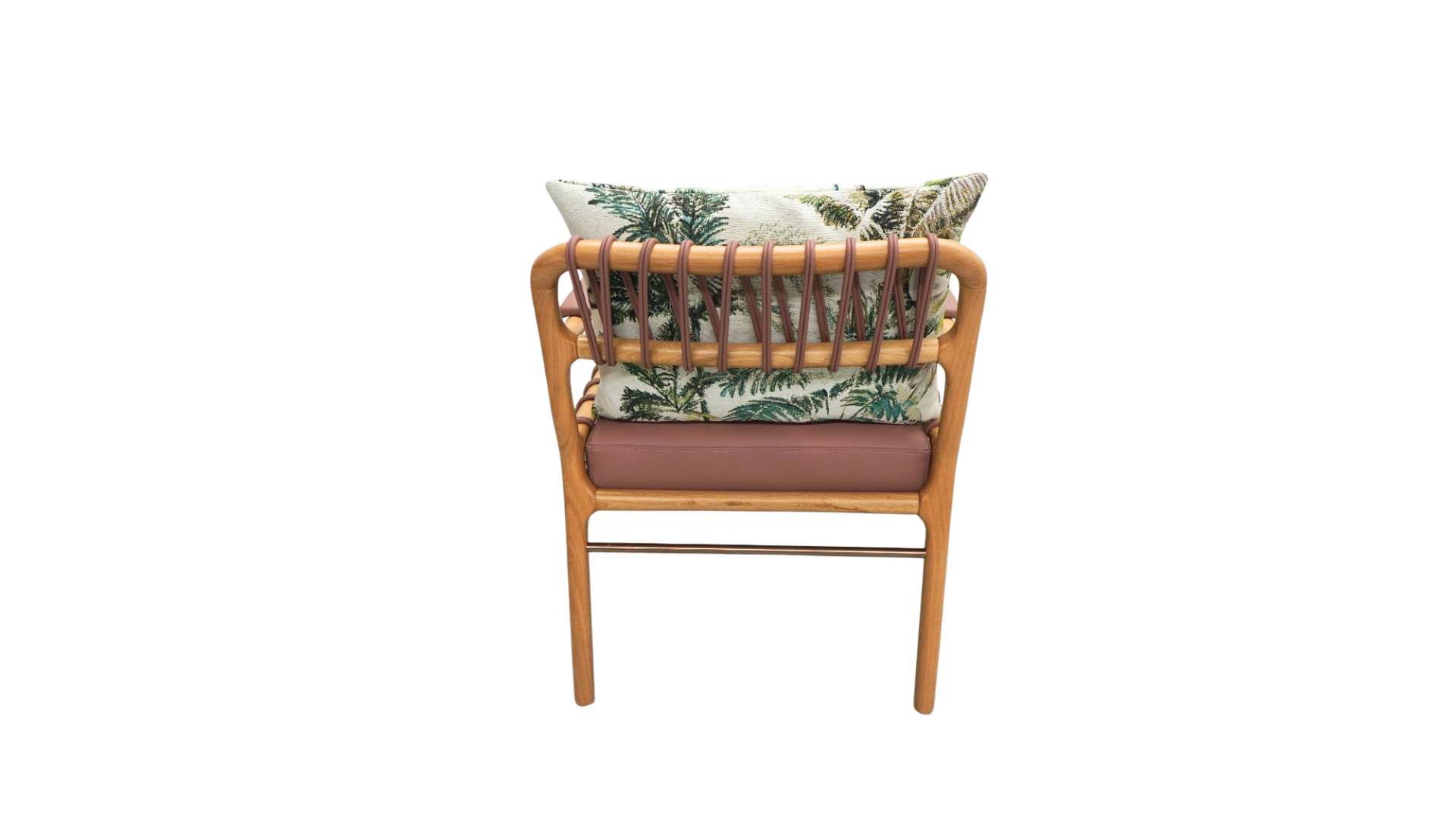 Chic armchair upholstered in light brown leather compliments its rich, natural wood finish highlighting its grain and texture.