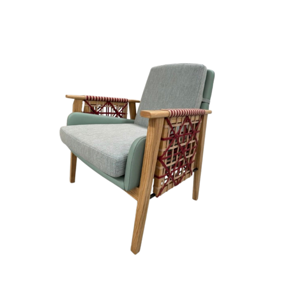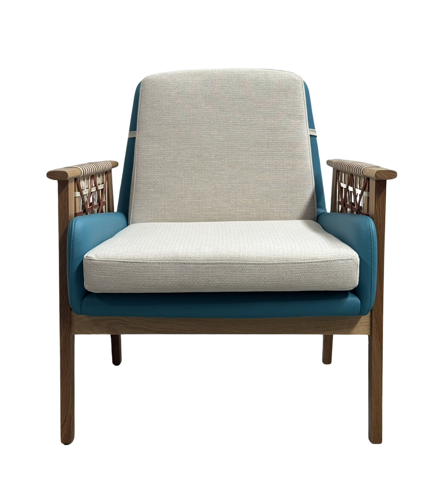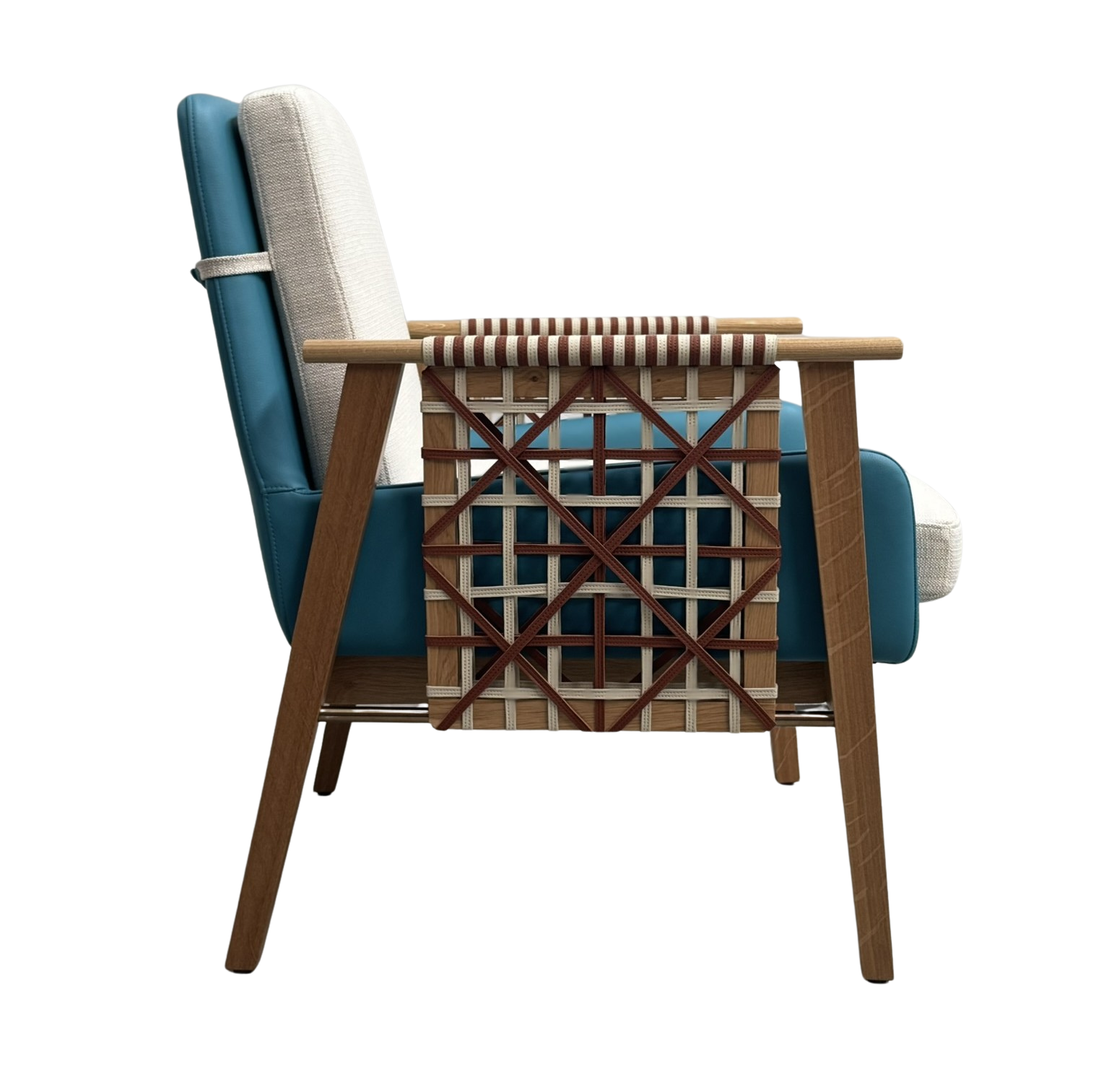 Elegant dining chair comprised of rich wood frame, upholstered seat and back in a leather shell, and leather weaving details along the arms.