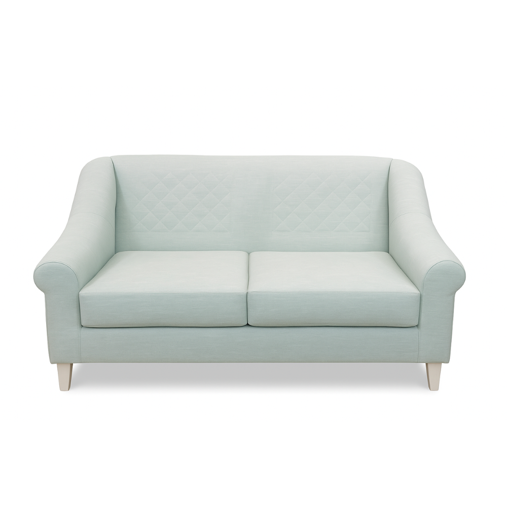 The Rhondelle Sofa brings a sense of refined comfort and timeless elegance to any living space. Its gently rounded arms and soft curves create a welcoming silhouette, while the subtle diamond-tufted detailing on the backrest adds a touch of sophistication. Upholstered in a serene pastel blue fabric, this piece exudes calm and versatility, making it ideal for modern homes or hospitality settings. The plush dual-seat cushions provide exceptional comfort, supported by tapered wooden legs in a light natural finish for a balanced, airy look.