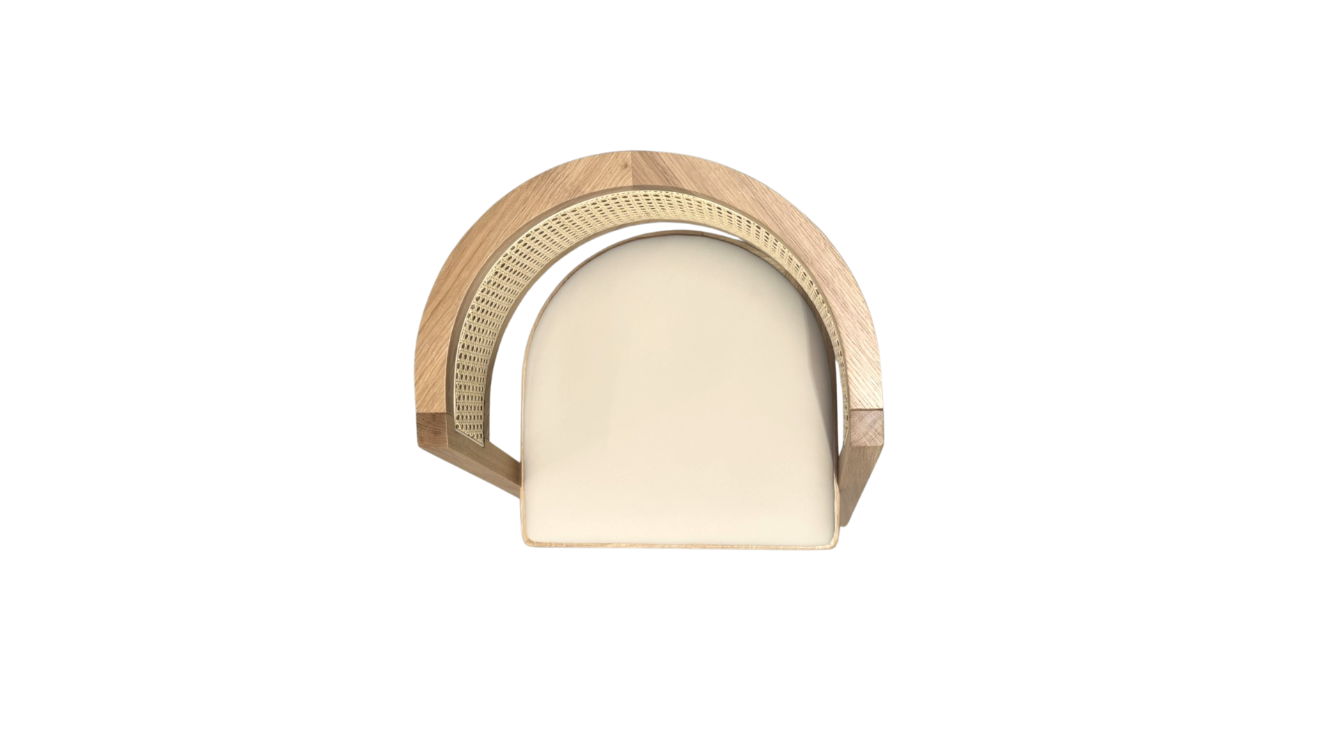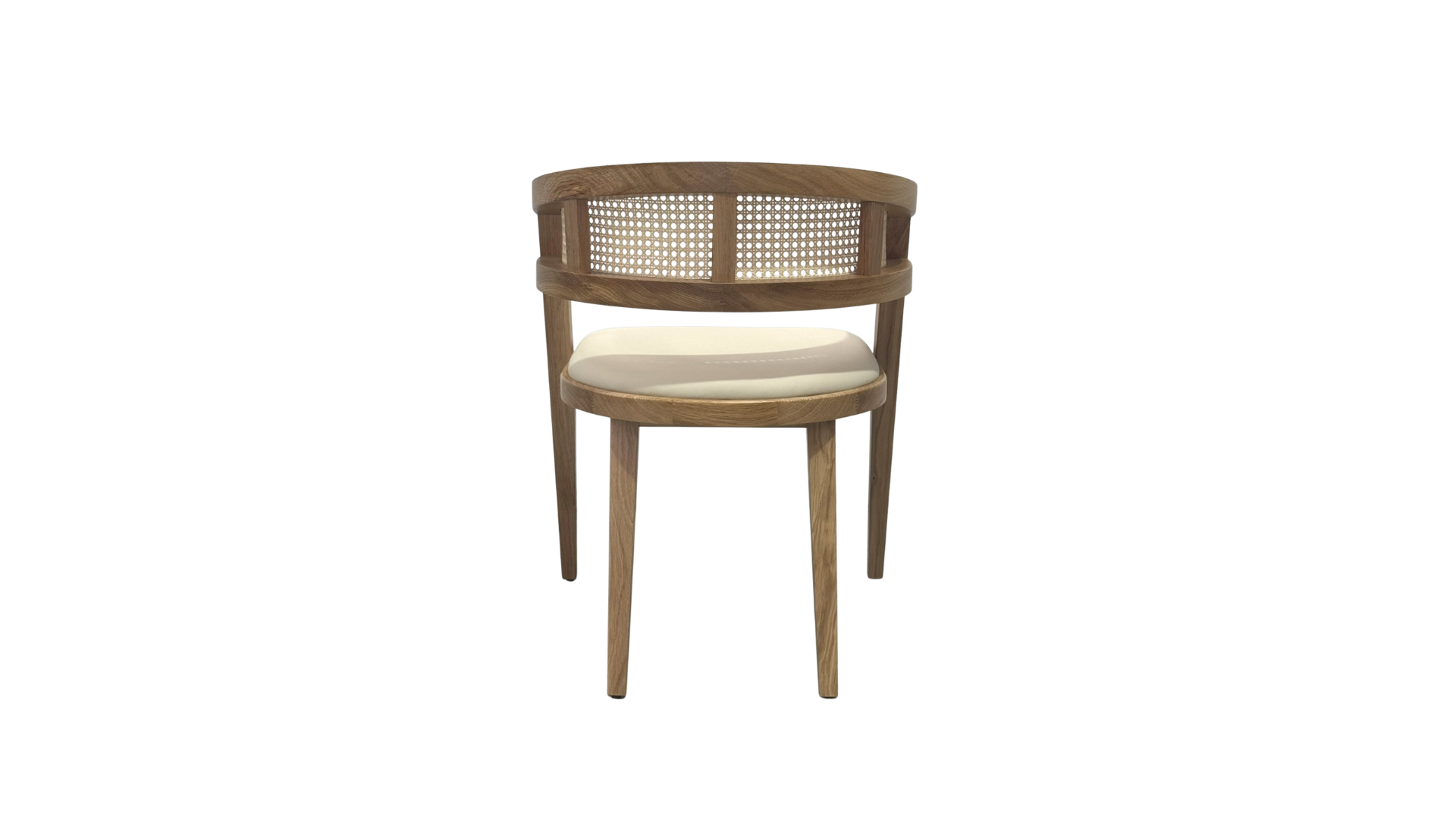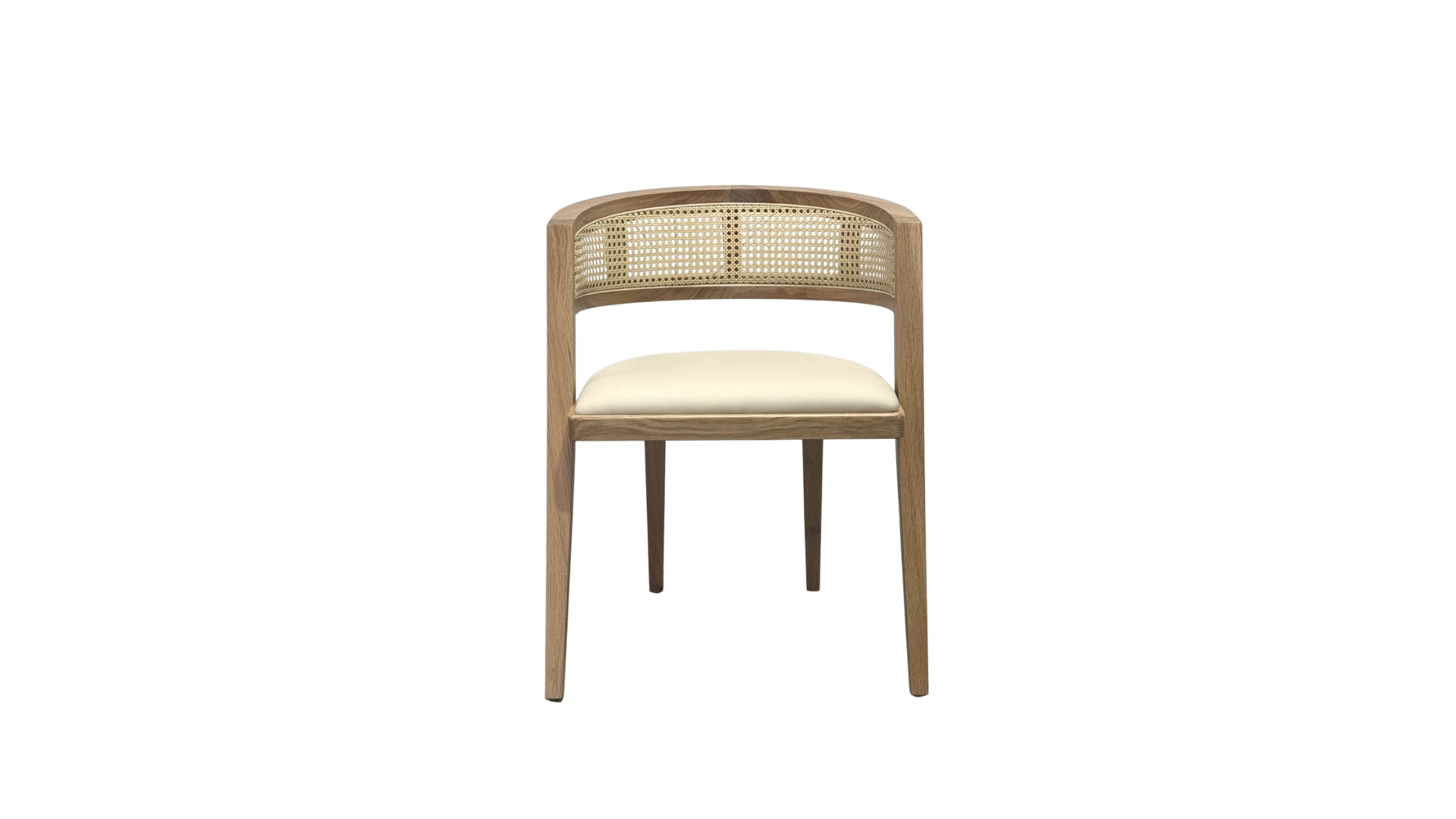Charming chair with a woven rattan textured barrel back is sturdy, yet lightweight, enhancing its overall aesthetic.